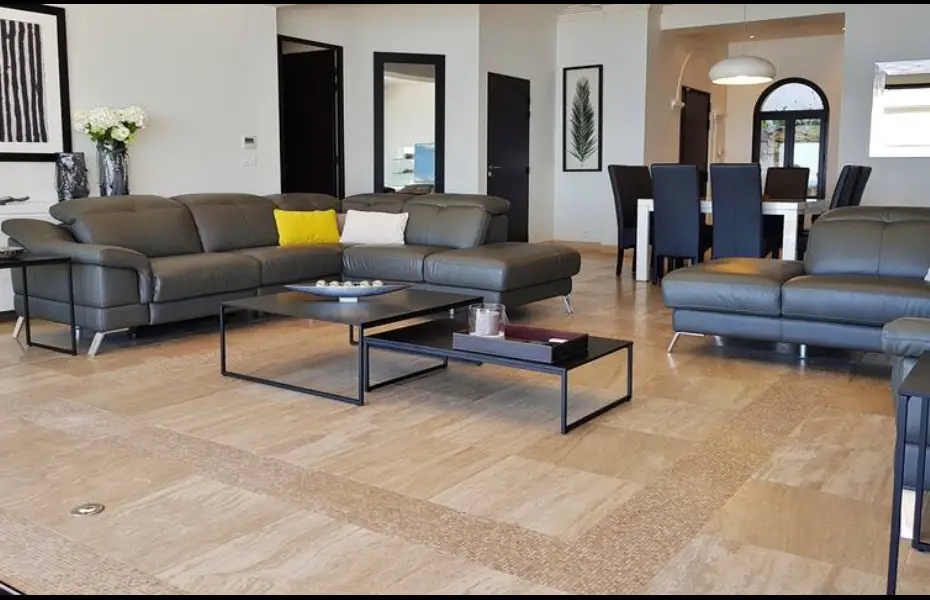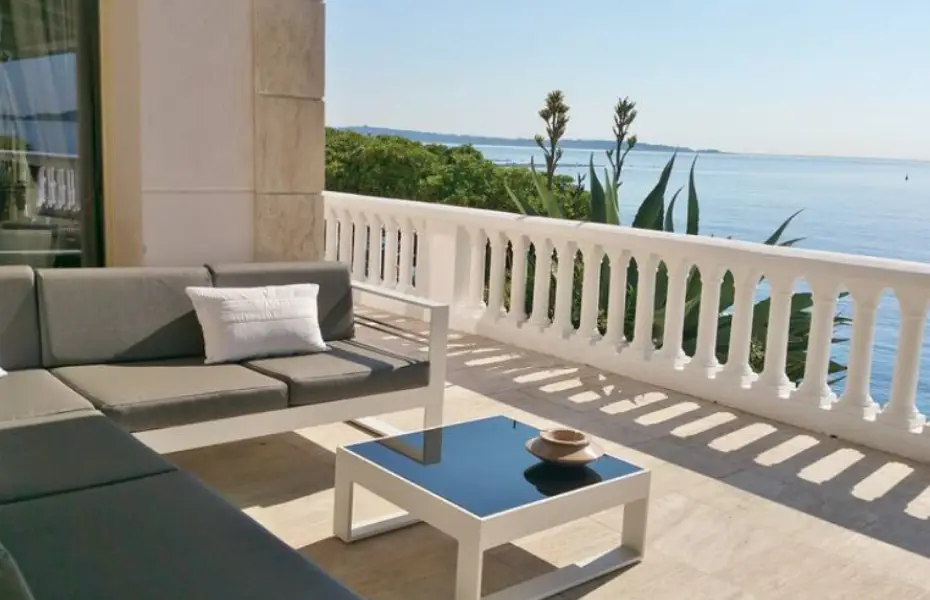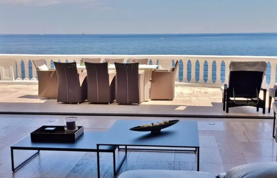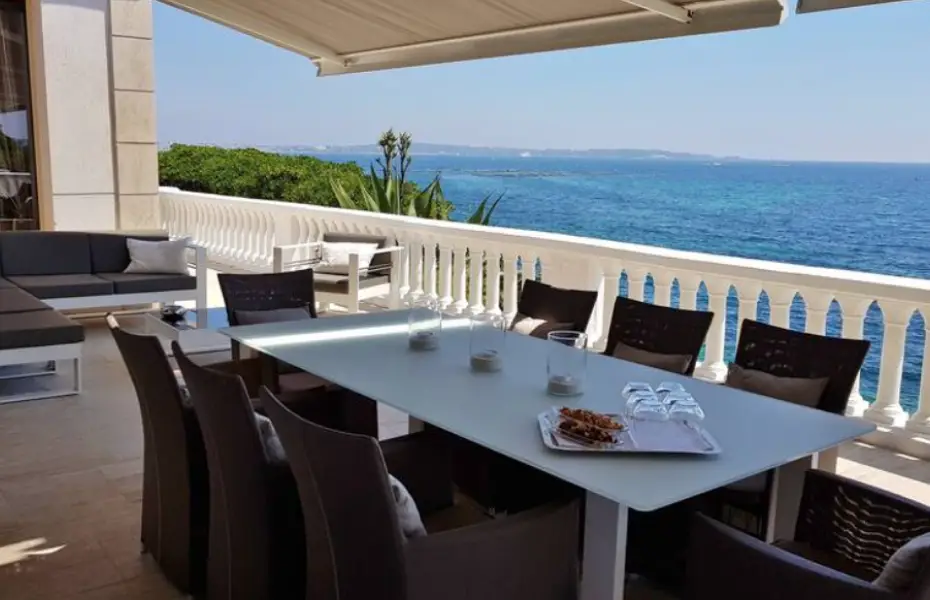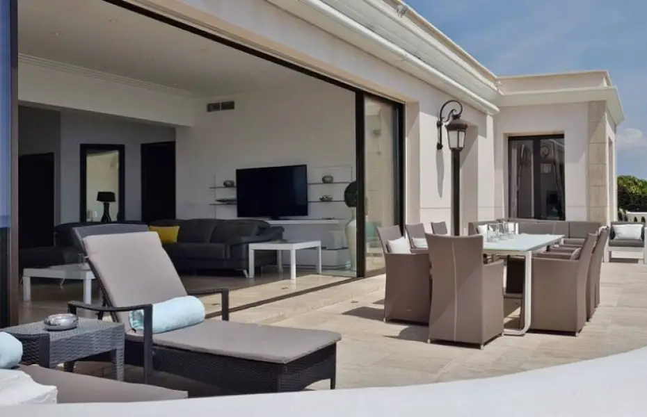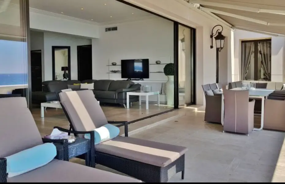 Direct access to the open-plan living/dining room (approx 70 sqm) with floor to ceiling windows offers superb sea views. There is a comfortable sitting area with white leather sofas and plasma television with satellite channels. There is a cloakroom in the entrance and a modern, fully equipped kitchen and sliding doors opening onto the small, back terrace. Adjacent to the kitchen is a small double/twin bedroom with en-suite shower.